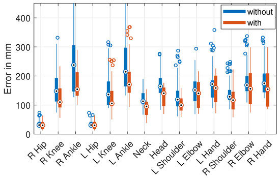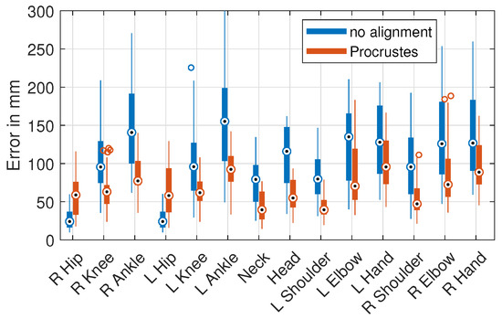 The joint harmonization of the H36M dataset changed the position of the neck, head, and hip joints. The neck joint, which was defined at a higher position than in the other datasets, was moved to the center between the shoulder joints. To move the head point closer to the neck, we multiplied the direction vector between the repositioned neck joint and the head joint by a factor of 0.885. The factor was calculated from the ratio of the means of the neck-to-head length of the H36M (227.3 mm) and the PAN test datasets (201.1 mm). The hip joint distance was reduced from the common center point to 0.775 of the original value, based on the mean distances (PAN 205.2 mm, H36M 264.9 mm). Figure 2c,d illustrates the effect of the adjustment.