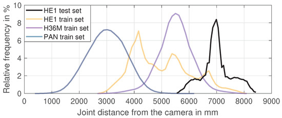 To be more precise, the positions of the head and hip joints of the HE1 dataset were harmonized as follows: To move the head closer to the neck, we multiplied the direction vector between the neck and the head joint by a factor of 0.636. We calculated the factor from the ratio of the means of the neck-to-head length of the HE1 (316.1 mm) and the Panoptic (PAN) test datasets (201.1 mm). The hip joint distance was increased from the common center point by a factor of 2.13, again based on scaling the direction vector by the ratio of the mean distances (PAN 205.2 mm, HE1 96.3 mm). Figure 2a,b illustrates the effect of our adjustment.