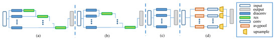 Different structures of multi-scale context modules. (a) Multi-scale context aggregation module (MSCA) w/o channel attention (CA); (b) cascade context pyramid module (CCPM); (c) scale pyramid module (SPM); and (d) scale-aware context module (SACM).