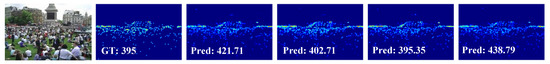 We used the first ten layers of VGG-16 pre-trained on ImageNet as the backbone. The initial learning rate was 1 × 10−5, and the optimizer was SGD with momentum. All experiments were performed on a C3 Framework [92,93] with a single RTX 2080 Ti GPU card and an Intel(R) Core(TM) i7-8700 CPU with 16 GB RAM and 512 GB ROM. The experiment software environments were the Pytorch 1.1 framework, Python 3.6, CUDA 10.1, and Ubuntu 18.04 LTS operation system. The data pre-processing and augmentation strategies of the above three datasets all follow the C3 Framework. The training batch size was set to 4 and 1 on UCF_CC_50 and the other datasets, respectively.
