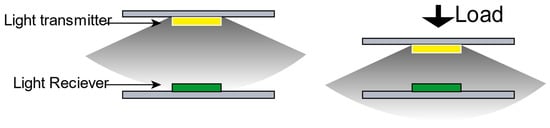Generally, when the walking foot touches the ground, the sole exerts a force on the ground through the insole and the shoehorn. During this period, the insole undergoes a certain degree of deformation in the direction perpendicular to the contact surface. We hope to use this tiny deformation relationship to induce the induction between the photodiode and the photoresistor. In other words, during the deformation process, the distance between the light emitter (light-emitting diode) and the light receiver (photoresistor) changes to cause a change in light, which in turn triggers a change in the resistance of the photoresistor, as shown in Figure 1. We use photoelectric technology to capture the slight deformation of the insole caused by plantar pressure. It is crucial to design an appropriate design structure to integrate the light-emitting diode and photoresistor into a narrow space with the limited thickness of the insole and provide a light-transmitting medium with suitable material properties.