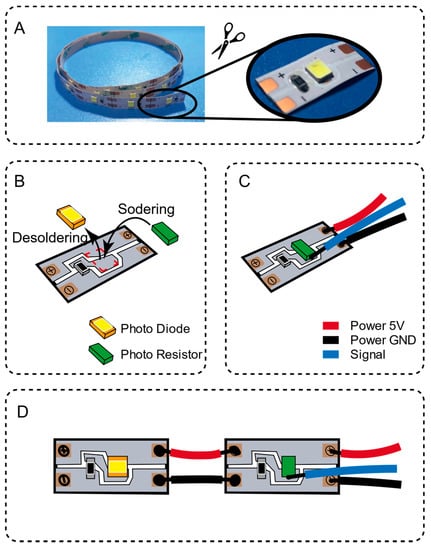 Fabrication of flexible circuit board inside the sensing unit. (A) cut out a single LED unit from the light strip; (B) replace the LED lamp beads with a photoresistor; (C) weld the power supply and signal wires; (D) weld the LED strip and the photoresistor strip together.