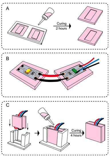 The integration process of the flexible module of the sensing unit. (A) Silica gel baffle pouring (B) The sensor unit is fixed on the silica gel baffle (C) Put into the mold and add the silica gel mixture to wait for solidification.