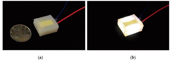 After preparing the circuit and the elastic medium, we used Autodesk Fusion 360 modelling software to design multiple molds for casting and used FDM3D printers to prepare the molds. As shown in Figure 3, one of the molds is used to make the sensor unit’s silicone shell baffle (thickness 1 mm). The other mold is used to integrate the entire sensor unit (including the silicone shell baffle, circuit and elastic medium). Figure 3B shows the process of fixing the sensing unit circuit in the grooves of the two silicone shell baffles and, finally, integrating it into a whole with the cured silicone medium. The final size of the sensor is a square flexible sensing unit which is 20 mm in width, 20 mm in length and 7 mm in height. One single sensing unit weighs 2~2.2 × 10−3 kg (silica gel density 700 kg/m3). Figure 4 shows the manufactured sensor with and without power supply status.