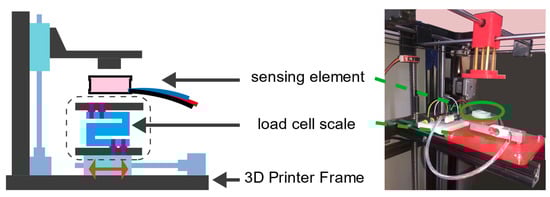We analyzed the mechanical and electrical characteristics of the manufactured modular sensing unit and calibrated the mapping relationship between the quasi-static pressure and the output signal. It is necessary to conduct a characteristic evaluation experiment on the sensing unit before being integrated into the insole. In the paper [], the author provides a low-cost calibration method that allows researchers to carry out the calibration test of pressure-related sensing units without using expensive calibration equipment. Here, we introduce an improved version. The calibration analysis system is shown in Figure 5. First, we established a calibration instrument according to the process described in [] to measure the load force and deformation during the static load test. The calibration instrument is a microsystem composed of three parts: (1) HX711 force measurement unit, on both sides of which are bolted 3D printed rigid plastic (PLA) boards; (2) HX711 amplifier circuit module; (3) an Arduino NANO microcontroller for collecting and recording data from the measuring instrument; secondly, we replaced the original printing platform of the FDM3D printer with a load cell. At the same time, the print head of the printer was replaced with a corresponding contact pressure head according to different test purposes. The loading and unloading can be designed by writing G-code control codes for the 3D printer test. In other words, compared to manually adding weight, the mechanical frame of the 3D printer makes the process more controllable.