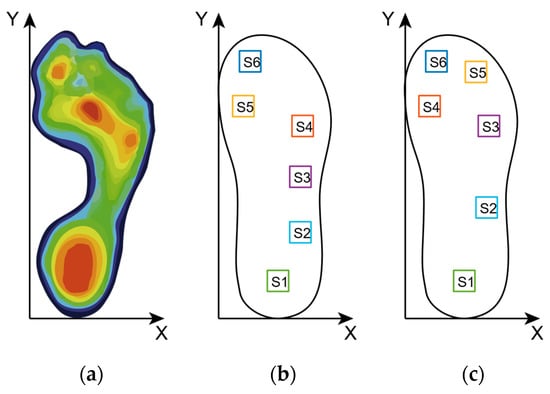 Because the difference in the foot size varies among different people, and the layout of the pressure-sensing insole does not have a proper guideline, two preliminary steps were made based on the author’s foot size. A flexible pressure insole solution, as shown in the figure: the layout of the sensor mainly refers to the aforementioned plantar pressure distribution. In the first solution, sensors are placed in six places: the first toe, the third toe, the first metatarsal, the fifth metatarsal, the outside of the arch of the foot and the heel. In the second solution, sensors are placed in six places: the first toe, the first metatarsal, the fifth metatarsal, two outside of the foot’s arch and the heel. “S1” in Figure 6b, c represents sensor 1, “S2” represents sensor 2, and so on.