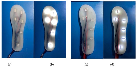 Two insole solutions for the right foot insole. (a) Insole solution No. 1 without power (b) Insole solution No. 1 with power (c) Insole solution No. 2 without power (d) Insole solution No. 2 with power.