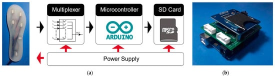To measure the sensor’s signal and record the data, we designed the circuit system according to the system framework shown in Figure 8. The circuit system is mainly used for sensor signal acquisition, data preprocessing and data storage, including a microcontroller module, a data storage module and a power supply device. Since the voltage divider circuit of the sensing unit has been integrated inside the sensing unit, there is no need to use additional modulation circuits and operational amplifiers to process the signal. The signal channels from the pressure sensing insole (6 per foot, 12 on both feet) are connected to the input port of the 16-channel multiplexer module (HC4067, NXP). Under the control of the microcontroller (Arduino UNO, Ivrea, Italy), the multiplexer traverses all the connection channels in turn, and transmits the collected analogue signal to the analogue input port of the microcontroller and passes the built-in ADC (analogue-to-digital converter), which converts the voltage signal into a digital signal for storage. The sensor signal data is recorded in a file on the SD card for offline analysis and evaluation of the performance of the plantar pressure-sensitive insole. To improve the overall ease of use, we designed an Arduino UNO expansion integrated circuit board to integrate all the above modules into the expansion circuit board, as shown in Figure 8. The entire system can be powered by a DC voltage source of 5 V~12 V for power supply, such as a polymer lithium battery.