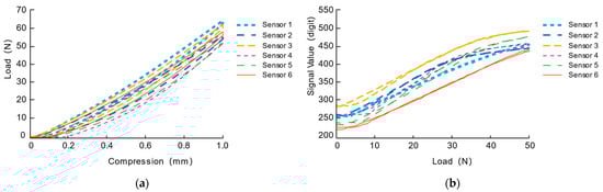As shown in Figure 9a, all sensing units exhibit certain mechanical hysteresis characteristics in terms of mechanical characteristics. According to the quantification method of mechanical hysteresis characteristics in the paper [], that is, through calculation, the ratio of the area enclosed by the loading range and the horizontal axis to the area enclosed by the unloading range and the horizontal axis in the curve is used to quantify the mechanical hysteresis characteristics. The mechanical hysteresis coefficients of each sensor are 0.928, 0.937, 0.947, 0.935, 0.921 and 0.933, respectively. We can observe that the mechanical characteristics of the pressure sensing unit are relatively consistent, which are mainly related to the characteristics of the silicone elastomer inside the sensing unit.