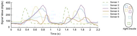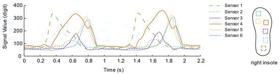 In addition, it can be estimated that the overall walking frequency is about 31 steps per minute from the periodically changing curve. Focusing on the data of each sensor of the insole, we can observe that, during the initial period from the “rest state” to the “active state”, the No. 1 sensor unit located on the heel first senses the pressure and quickly rises to the peak; then, as the pressure of the No. 1 sensor gradually decreases, the pressure of the No. 2 sensors located on the outside of the arch of the foot also change; secondly, the No. 3, No. 4 and No. 5 sensors located on the forefoot and the toes were in the same interval, reaching their respective peaks over a long time; finally, all sensor signals return to a lower level of resting state. Connecting the pressure curves of the left and right feet, we can see that in the short period when the pressure of the right foot is about to enter a lower level, the heel pressure of the left foot has already been generated and rapidly increased to the peak. Similarly, the pressure of the left foot is about to enter a higher level. During the short period of low level, the heel pressure of the right foot has also begun to reach its peak rapidly, which also reveals the “bipedal standing phase” that is not easily noticeable when walking. Both feet are in contact with the ground during walking.