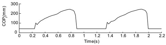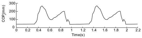 To further compare the quality of the two solutions, the pressure centers are calculated by Equations (1) and (2), as shown in Figure 12 and Figure 13. From the of the curve of solution No. 1, we can observe that the plantar pressure center during the stance phase is disturbed suddenly and, then, the of the curve of the solution No. 2 can better reflect that the pressure center is standing. The tendency of the phase is to move from the heel to the toe, therefore the layout of the second solution is regarded as a better sensor layout.