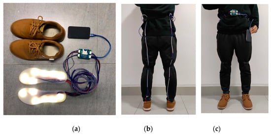 We completed the left foot insole production according to the same production process as the right foot insole. Since the circuit system design reserved up to 16 sensing channels for both feet, one only needs to open the left foot sensing channel in the acquisition program to acquire all the sensing channels of the feet (a total of 12 sensing units). The equipment used for the bipedal gait data collection experiment is shown in Figure 14, including a pair of versatile 43 size shoes and a pair of self-designed two-point photoelectric pressure sensor insoles. Before collecting data, the wearer uses a nylon bayonet to fix the wire on the back of the lower limbs, in the manner shown in Figure 14, to avoid the influence of wire swinging on the usual walking movement during walking. The nylon bayonet and cable tie are fixed on the wearer’s waist, and the power bank can be placed in the wearer’s trouser pocket after power is supplied to achieve the minimum hindrance to walking. The gait data of a subject was collected using the device. The subject has never suffered from any disease that hinders walking posture. The experiment process is also from a natural standing state to a waking state with an average pace followed by staying still for a few seconds.