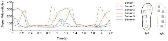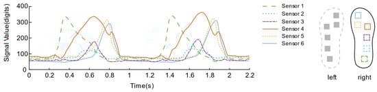 Figure 15 and Figure 16 describes the dynamic bipedal walking experiment data. Observing the data, each sensor presents a periodic “rest state” and “active state”. During the “active state”, the sensor signals reach their respective peaks in succession. During the “resting state”, all sensors returned to their lower levels, which is consistent with our intuitive impression of the phase of standing support and swing phase during the complete gait cycle of a single leg.