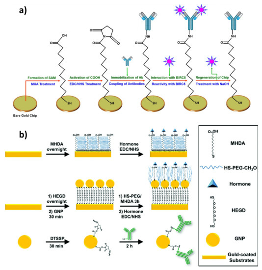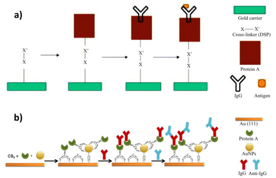 In 2003, Lee et al. fabricated an immunosensor that determined bovine serum albumin in a probe. The device was based on a self-assembled monolayer of modified protein A, where the surface group of the compound was substituted with thiol functionality. The modified layer resulted in an increased antibody binding capacity and, with this, showed a better capture of the antigen [117]. Bakhmachuk et al. developed a biosensor that was dependent on the recombinant Staphylococcal protein A, with an added cysteine residue. Genetic engineering enabled the introduction of the attachment site into an expendable part of the protein, which increased the immobilization level of the molecule. The interaction between the thiol group and the surface of the gold sensor chip is much stronger and more reliable than physical adsorption [118]. Juan-Franco et al. also investigated the ability of modified protein A to form an appropriate layer for enhanced immunosensing. The staphylococcal immunoglobulin-binding domains were fused with a gold-binding peptide (GBP) forming PAG—the protein A gold-binding domain. This modification provided an easy and directed immobilization of the antibodies against human growth hormone, where Fab fragments remained freely exposed to the epitopes [119]. Schmid et al. used thiol-based homobifunctional cross-linker dithiobissuccinimide propionate (DSP) to covalently immobilize protein A on a gold surface. A sterically accessible, stable, and uniform antibody coating was achieved (Figure 6a) [120]. Sohn et al. also formed a layer of protein A on a chip modified with (3-aminopropyl)triethoxysilane (APTES), using a cross-linker (EDC-NHS) for the site-directed immobilization of the antibodies, and compared the results with non-activated protein A and a self-assembled monolayer [121]. The greatest sensitivity of the chip was obtained with protein A activated already with the cross-linker. The use of a cross-linker is relatively easier in comparison to engineered protein G or A, and it allows for antigen detection at very low concentrations. Streptococcal protein G was utilized by Hsu et al. to form a covalently attached layer for the immobilization of monoclonal antibodies. Three types of antibodies against pentamer C-reactive protein (CRP) and modified CRP were used for the subsequent detection of these molecules. No false signals were observed, and a sufficient sensitivity for the detection of this biomarker in biomedical samples was acquired [122].