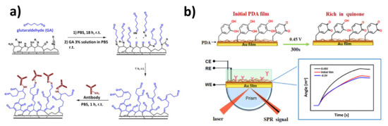 Examples of polymeric interphases employed in SPR immunosensors. (a) amine-terminated cyclopropylamine plasma polymer, (b) quinone-terminated polydopamine film. Adapted with permission from Makhneva et al. [84] (Copyright © (2018) Elsevier) and Chen et al. [89] (Copyright © (2018) Elsevier).