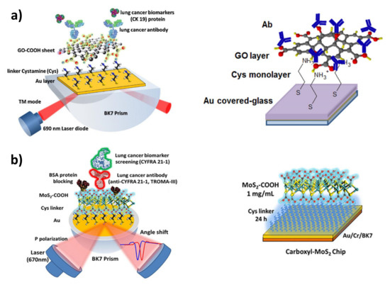 - Chiu, N.-F.; Yang, H.-T. High-Sensitivity Detection of the Lung Cancer Biomarker CYFRA21-1 in Serum Samples Using a Carboxyl-MoS2 Functional Film for SPR-Based Immunosensors. Front. Bioeng. Biotechnol. 2020, 8, 234. [Google Scholar] [CrossRef] [PubMed]
