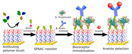 Dutra et al. used a carboxymethyldextran-modified gold chip covered with covalently coupled streptavidin forming a monolayer for the attachment of biotin-tagged anti-troponin T monoclonal antibodies. An immobilized layer together with an SPR apparatus served as an immunosensor for human cardiac troponin T. This method enables identification in real-time, with a detection limit around 0.01 ng/mL, which is comparable to ELISA methods [150]. There are many other approaches where biotin/streptavidin interactions were used together with SPR to form an immunosensor for the detection of moieties of biological origin or for studying the interplays between them, e.g., markers [151], heparin [152], hormones [153], and viruses [154,155]. An example of a hybrid architecture combining the use of oligo(ethylene glycol) methyl ether methacrylate backfilling and affinity-based immobilization via avidin-biotin interaction is the SPR biosensor described by Parrillo et al. The employment of a thick polymer brush reduced non-specific adsorption, thus enabling analysis of blood plasma. At the same time, the biotin tag, which has been easily introduced by alkyne-azide cycloaddition, opened the way to the fast and effective anchoring of labelled immunoreceptors (Figure 7) [90].