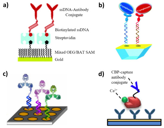 Various concepts of DNA-directed immobilization in the construction of SPR immunosensors: (a) immunosensor based on DNA anchoring via Av-Bt affinity, (b) direct SPRi assay for the detection of lymphocytes, employing DNA hybridization in sandwich-like format, (c) competitive SPRi immunoassay with the use of DNA-steroid conjugates, (d) immunosensor using Ca2+-dependent antibody-directed immobilization. Adapted with permission from Ladd et al. [167] (Copyright © (2004) American Chemical Society), Leroy et al. [170] (Copyright © (2004) Royal Society of Chemistry), Tort et al. [172] (Copyright © (2012) American Chemical Society), and Kim et al. [173] (Copyright © (2017) Elsevier).