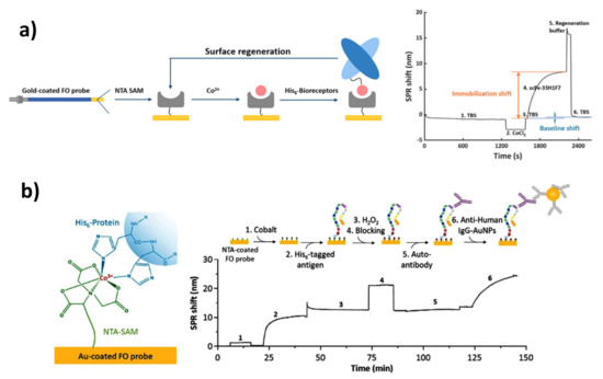 Affinity tags have multiple advantages, such as having mild conditions for capturing, the capacity for site-directed immobilization, low price (usually), and the possibility of regeneration the chip. At the same time, they require the use of genetic engineering techniques. Apart from the use of substrates functionalized with super-antigenic proteins (proteins A, G, and A/G), another approach adapted from the methods of protein purification is immobilization with the use of a polyhistidine tag through bivalent ion-nitrilotriacetic acid (NTA) complexes [179]. This pathway is particularly convenient in the case of designing immunosensors in a competitive format, where recombinant proteins or synthetic oligopeptides are involved in the receptor layer. Importantly, when the receptor/analyte-binding mechanism is well known, it is also possible to design and deliberately insert a his-tag into such a region of the receptor, which will facilitate the process of oriented immobilization, without negatively affecting the binding sites [180].