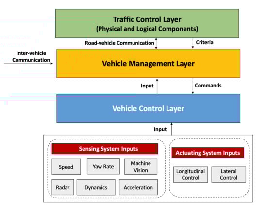 The vehicle control layer is responsible for two functions: (i) to detect the conditions and state variables of the following and neighboring vehicles and (ii) to activate the lateral and longitudinal actuators. This layer takes input from the sensing systems (such as various sensors for acceleration, radar, yaw rate, vehicle speed, and vision) and the actuating systems (lateral and longitudinal control), and outputs the vehicle management layer seeking to obtain steering and vehicle speed queries. The vehicle management layer is in charge of determining the moment of every single vehicle under the constraints of cooperative driving by utilizing the data from control layer, neighboring vehicles through IVC, and the traffic control layer through road-vehicle communications. The traffic control layer made up of two components: physical and logical. The physical part is composed of a traffic signal, sign-boards, and road-side communication, whereas the logical part deals with the social laws, rules, manners, and other societal ethics. Finally, this layer passes on the traffic information with each vehicle in the management layer to maintain coordination and to perform actions [2,6].