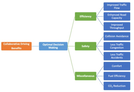- Why do we need to do collaborative driving? The underlying concept of vehicular cooperation is to make optimal joint driving decisions and get benefitted from the cooperation, reducing costs by mutually cooperating with each other. Having reviewed the literature, we highlight and classify the potential benefits of collaborative driving into three categories: traffic efficiency, safety, and miscellaneous, as shown in Figure 3.