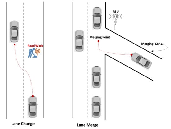 - Sequeira, L.; Szefer, A.; Slome, J.; Mahmoodi, T. A lane merge coordination model for a V2X scenario. In Proceedings of the 2019 European Conference on Networks and Communications (EuCNC), Valencia, Spain, 18–21 June 2019; pp. 198–203. [Google Scholar]