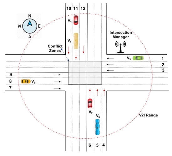 Standard 6-lane 4-leg intersection management. Source: Adapted from Reference [37].caption