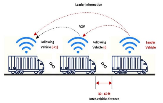 Vehicle platooning, also known as convoy driving, is the practice of driving a group of two or more consecutive vehicles nose-to-tail on the same lane with small inter-vehicle spacings typically less than 1 s at the same speed. In platooning, the vehicles are linked virtually by Lidar and communicate with each other via wireless communication technologies, such as (CACC). The platoon shown in Figure 6 is comprised of two types of vehicles: the platoon leader (PL) and follower vehicle (FV).