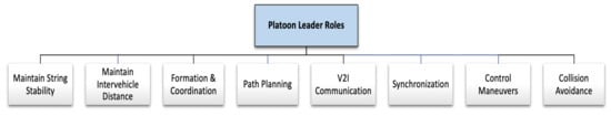 Usually, each following vehicle is denoted with a number, FVI, FVII, and so on, to indicate its position within the platoon. The lower number is, the more the following vehicle is closer to the leading vehicle. The leading vehicle drives at the first position and follows by a couple of follower vehicles, which means FVs can automatically brake, steer, and decelerate, depending on the actions of the leading vehicle [59]. The vehicles in the platoon coordinate their lateral and longitudinal control to maintain the required headway from their leading vehicle [60]. The leading vehicle controls the driving direction, and the FVs follow the leading vehicle using advanced technologies, such as adaptive cruise control, automated emergency braking, blind-spot warning, forward collision avoidance system, lane departure warning, etc. Once the platooning mode is activated, the following vehicles start following the leading vehicle automatically without the intervention of their drivers. The V2V communication allows the vehicles to communicate back and forth; therefore, leading vehicles can also adjust their speed and position based on the response of the FVs. The wireless coupling and decoupling in platooning make it easy for vehicles to hop-on or hop-off from the platoon on the fly without needing to stop the driving.