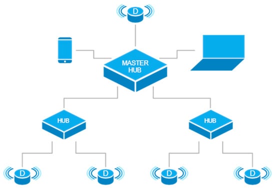 The qToggle ecosystem is composed of a qToggleServer, qToggleOS, espQToggle, add-ons, and other tools and packages that are specific to certain setups and use cases. The main component is qToggleServer, which is written in Python. It acts as a hub and provides the user-friendly web app. qToggleOS is an operating system (OS) ready to be used with Raspberry Pi boards and runs qToggleServer. espQToggle is a custom firmware for ESP8266/ESP8285 devices and implements the qToggle API. Finally, add-ons are optional pieces of software that enhance the functionality of qToggleServer. A device used by qToggle will describe itself, indicating its configuration, its supported optional functionalities, and what ports it exposes. Each port, in its turn, will describe itself, indicating its identifier, type, configuration, and so on. By combining master–slave relationships between simple devices and hubs in a network, a complex tree topology is obtained. Thus, a large number of smart devices can be easily managed, as shown in Figure 2. The type of communication in Figure 2 is Wi-fi or Ethernet. Consumers could operate at any level in the hierarchy, thus limiting the access inside the network to any desired subtree.