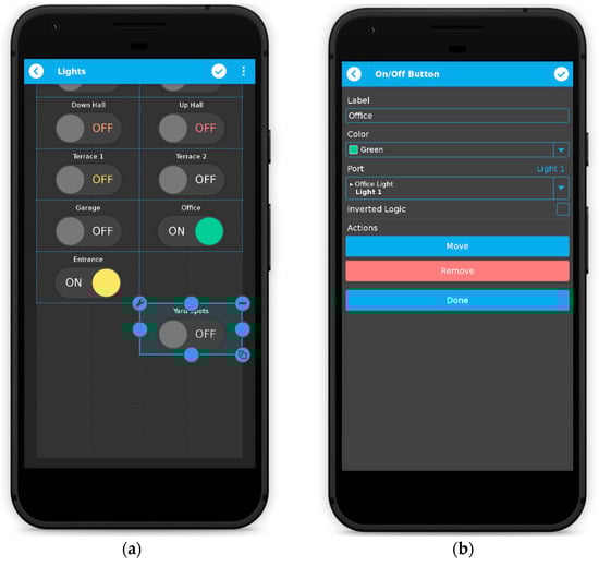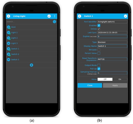 The purpose of controlling the indoor temperatures is to maintain thermal comfort and to save energy cost. In this case, the thermostats system offers the following advantages: the ability to access and control the indoor temperature anytime and from anywhere using qToggle app on the mobile phone, as presented in Figure 8a, the ability to monitor and separately set the temperature in individual rooms (not every room has the same heating requirements), and, finally, the ability to enable scheduling (lower the temperature during the day, when nobody is home, or during vacation). In this way, manual adjustments are eliminated to save time and effort.