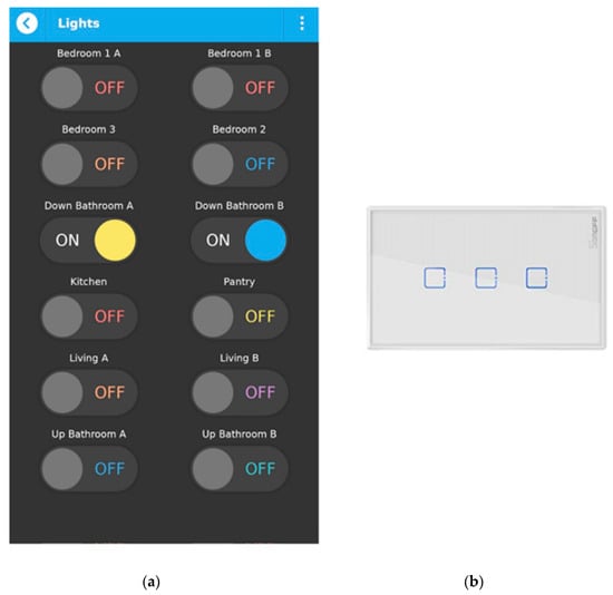 Switching on and off the lights in a house with qToggle app (a) and the Sonoff Touch device (b).