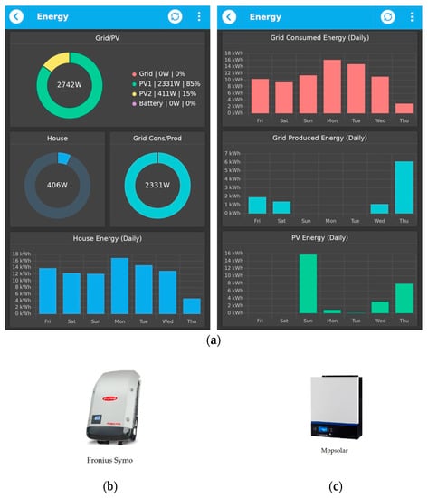 Solar installations require a dedicated solar inverter that converts solar power from the PV system into an alternating current. Inverters that are able to inject the excess of energy into the grid are called on-grid (or grid-tie) inverters and, in many countries, are subject to stricter rules than those that work off-grid. One of the most notable requirements for a grid-tie inverter is the anti-islanding protection: in case of a grid power outage, the inverter must immediately stop injecting energy, thus protecting electrical workers and upstream equipment. For this case study, the PV power inverters are from the following brand manufacturers: Fronius for PV1 (see Figure 10b) and MPPSolar for PV2 (see Figure 10c).