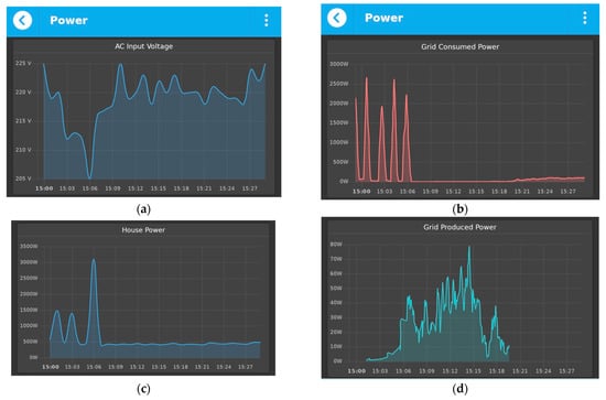 We consider that voltage monitoring is essential because the actual voltage supplied by the grid operator often varies from its nominal value, possibly causing faults to the electrical equipment. The chart (shown in Figure 11a) as well as its underlying historical data may serve as proof in case of appliance damage. The excess of solar produced power can be either used for household electrical necessities or it can be injected into the grid. Hence, we have the total house power (shown in Figure 11b), as well as the consumed and injected grid power (shown in Figure 11c,d).