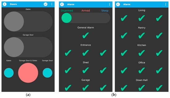 Access control involves controlling entrances, gates and doors, in this case study, the gates and the garage door, specifically. Various options can be chosen: to fully open or close only the gates, only the garage door, or both at the same time, or to keep half open one of them or both, as shown in Figure 12a. Access control can be done manually, using the app, and by vocal commands, using Google assistant on a smart watch. To control gate motors and the garage door, we used two Blitzwolf SS1smart relay boards that enable remote opening/closing. This allowed us to mimic the conventional gate remote control using our Wi-Fi-based system.