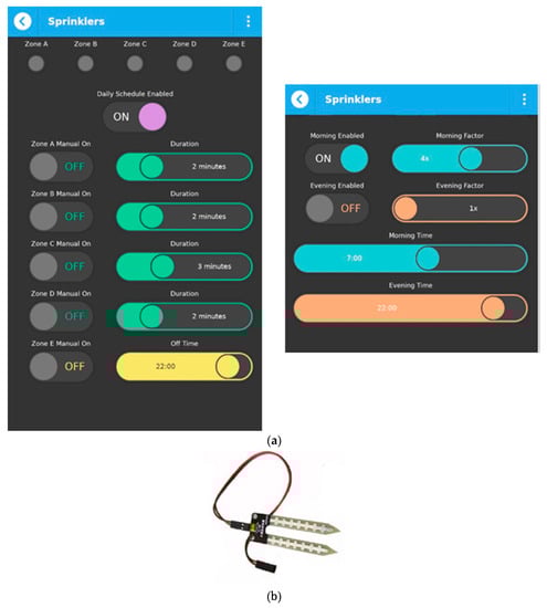 Automated irrigation systems help people control the water used in their gardens or fields and, thus, to avoid water waste, to save energy and time, and to minimize water bills. Using an automatic system based on valves instead of the classical manual irrigation also avoids human errors, for example forgetting to irrigate one day, not being able to do it, or forgetting to turn off the water after irrigation. The proposed irrigation system is based on Raspberry Pi and controls a number of pop-up sprinklers. The system inside the well contains: electric valves (Rain Bird DV/DVF valves), one standard 1.1 kW water pump, a Raspberry Pi board connected to the house LAN, and a pressure switch (Easy Press II model, with a maximum pressure of 10 bar). Figure 13a shows how the irrigation system can be controlled using the qToggle app. The user is able to select two modes: the manual one where he can start and stop irrigations whenever he wants and in which zone he wants and an automatic mode, with or without humidity sensors (YL69 sensors from SparkFun, in this case, shown in Figure 13b).