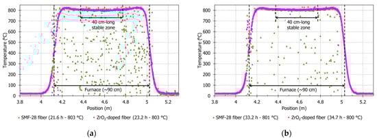 | ZrO2-Doped Fiber | First Cyclic Test Step at 23.2 h 803 ± 6 °C | Last Cyclic-Test Step at 34.7 h 800 ± 6 °C | ||