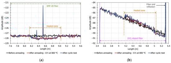 3.3. Evolution of OFDR Signal Amplitude for Both Fibers after Heat Treatment