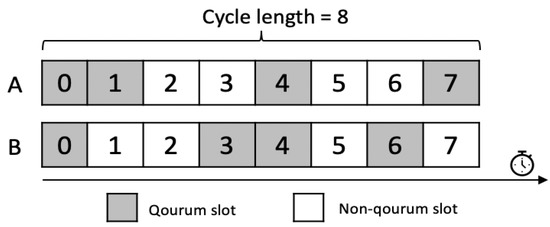 For example, is a quorum system with three non-empty subsets under . There are several kinds of quorum systems, such as grid [25], cyclic [26], torus [23] and others [27,28,29].