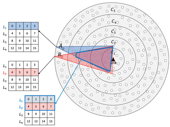 An example is shown in Figure 3. Node A and its upstream forwarders are assigned line L1, nodes in the blue sector in Figure 3. Node B, which is a neighbor of A, will wake up at L2, as illustrated in Figure 3. It should be noted that even if there is an intersection between A’s sector and B’s sector, as shown in Figure 3, the intersecting nodes will have a higher active ratio as they first wake up at slots 0, 1, 2, and 3 with node A and then wake up at slots 4, 5, 6 and 7 with node B. The next sections will explain how to define the appropriate grid size and how to allocate a unique line from the grid to nodes in the last corona nodes.