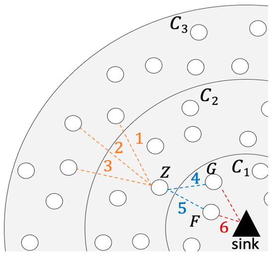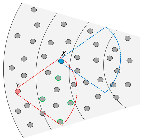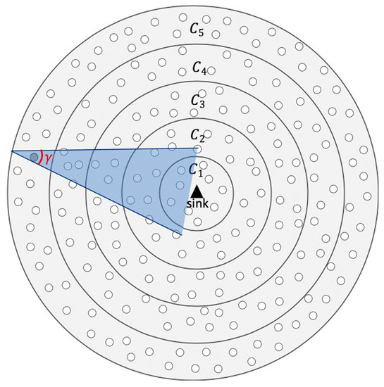 Next, let represents the sector’s number in which node is placed. Accordingly, is a unique number between 0 and , the maximum number of sectors, and can be derived as