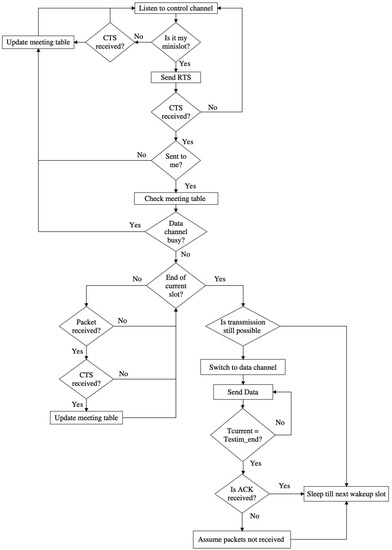 Sender behavior: At wakeup slots, a node having a packet to send will calculate the number of packets to send and . Then, it will send a RTS that includes on its minislot to its next-hop forwarders. If the next-hop forwarders successfully received the RTS, then they will back off and send a CTS. Nodes maintain a ‘meeting table’ that contains the in-progress communications with the used data channels along with their estimated end times. When a sender node receives the CTS, the sender will check if the packet is destined to it. If so, it checks the meeting table. If the pre-selected (see Section 3.4.1) data channel is busy, the sender will cancel its transmission. If the data channel is free, the sender waits until the end of the current slot before switching to the dedicated data channel. During the slot time, when a node receives a packet, the node will keep the meeting table updated to avoid collisions at the data channel. The sender will proceed sending the number of packets announced during the handshaking at the data channel. Then after the estimated end time, the receiver sends an acknowledgment with the identifiers of the successfully received packets. When the ACK is received, the sender will read the ACK and try to resend the non-received packets at the next wakeup slot. If the ACK is not received, the sender assumes all the packets were not received and tries to resend them at the next wakeup slot.