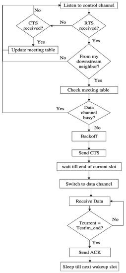 If , which means that the node has more than half of its initial energy, the node set the backoff time at the first half of the contention window and hence the backoff interval is set equal to . Otherwise, the backoff interval is set at the second half, This way, the next-hop forwarder with higher remaining energy will be more eligible to reply first and hence the energy consumption is balanced among nodes. After a receiver node sends the CTS, it waits till the end of the current wakeup slot, then switches to the data channel. Note that during the wakeup slot if a potential next hop forwarder receives a CTS destined to its downstream node then it will refrain from sending its own CTS as the sender is well served by a forwarder with higher remaining energy. At the dedicated data channel, the receiver will listen to the channel without sending an acknowledgment till the expiration of . After that, it will send the acknowledgment with the IDs of non-received packets in case of lost packets. Figure 10 and Figure 11 demonstrate the sender and receiver behaviors.