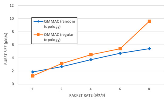 QMMAC allows nodes to send multiple data packets once it succeeds handshaking with one of its forwarders. Thus, the throughput is increased and the end-to-end delay is reduced. The burst size is defined as the average number of data packets transmitted per handshaking (RTS/CTS). Figure 13 shows the average burst size of QMMAC in both topologies. With the increase of the traffic rate, the burst size is increased as the nodes have more data packet in their queues.