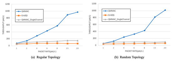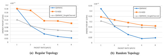 The average consumed energy per successful bit is shown in Figure 20. As expected, for all the protocols, the throughput is increasing and hence the energy efficiency is increasing with the traffic rate. Most importantly, QMMAC is more energy efficient than GridQS and QMMAC single channel. In fact, according to QMMAC, with increased traffic rate, the burst size is increasing too; therefore, more data packets are transmitted per single handshaking exchange. Consequently, more packets will be delivered with the same consumed energy for a single RTS/CTS exchange. At 1 packet/s, QMMAC is consuming more energy than the other protocols. Indeed, in GridQS and QMMAC single channel, a node needs to wake up at one fifth of the slot duration to exchange RTS and CTS, and then go back to sleep if no data communication is taking place. Unlike that, in QMMAC, the node will be awake during the whole wakeup line to update its meeting table to avoid collision, and thus more energy is consumed. That being said, this further energy consumption due to idle listening will be compensated when the traffic rate increases as it will be beneficial to avoid collisions, and hence we end up with higher energy efficiency.