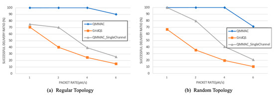 Figure 15 depicts the successful delivery ratio as function of the traffic rate. The successful delivery ratio is the number of packets successfully received by the sink to the number of packets sent by all nodes. The delivery ratios of GridQS and QMMAC-single channel are low due to the increase of control packets collisions with the increase of the traffic rate, and thus the packets could not be delivered to the sink as a successful handshaking is needed for every data packet. For nodes running QMMAC, the average delivery ratio is 97% not only because of the use of the multichannel and burst features but also thanks to the minislots assignment and the energy-based backoff, which avoids or even mitigates the control packets collisions.