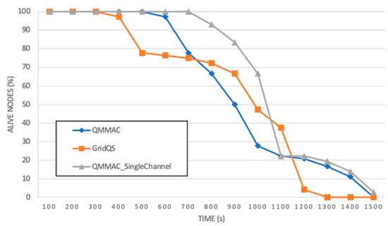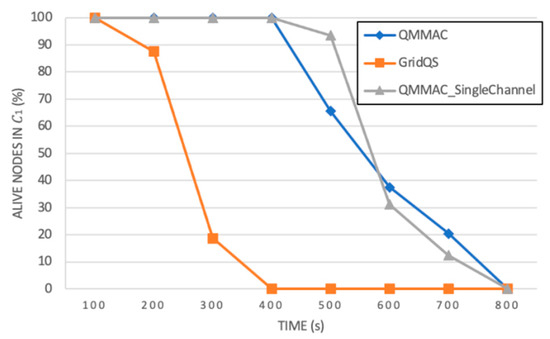 Let us now define the network lifetime as the time till nodes in die. Accordingly, we observed the alive nodes in for all protocols. As shown in Figure 19, all nodes in of GridQS die at time 400 s; hence the network will stop functioning. It should be noted that at time 400 s all nodes running QMMAC (multichannel and single-channel) are still alive. As shown in the figure, QMMAC extends the lifetime of nodes not only by reducing the idle listening, overhearing and collision, but also by balancing the energy between forwarder nodes using the energy-based backoff.