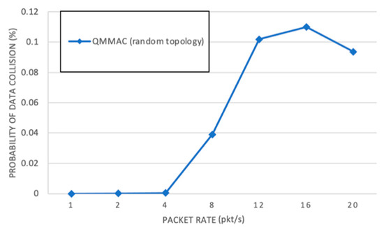Figure 21 shows the collision probability on data channels as a function of the traffic rate. By assigning wakeup neighbor nodes a unique slot and a unique channel, QMMAC tries to provide collision-free communications. However, when two non-neighbor downstream nodes, which use the same channel set, assign the same channel set to two neighbor nodes, a collision may occur at the data channel. These two nodes’ packets may collide if and only if they miss each other CTSs. If a node is busy transmitting on a data channel while its neighbors transmit their CTSs on the shared control channel, the node can miss their CTSs. The following scenario even very unlikely, may occur. Figure 22 shows an example of the unlikely data collision. Node A and B non-neighbor nodes are both assigned channel set 4. They allocate channel set 2 to their next-hop forwarder nodes C and D, respectively. Suppose D is a forwarder for node E and nodes C and D are neighbors. If node A and node C successfully handshake and agree to communicate for the next four slots, while E and D communicate on channel 9, node D will be unaware of their communication. After node D completes its transmission and back to the control channel, if nodes D and B successfully exchange RTS/CTS, they may go to channel 7 for data transmission before C and A complete their transmission. Accordingly, at node D, node C acknowledgment may collide with node A data packet. As shown in Figure 21, our protocol achieves extremely low collision probability since the above-described scenario is infrequent to occur.