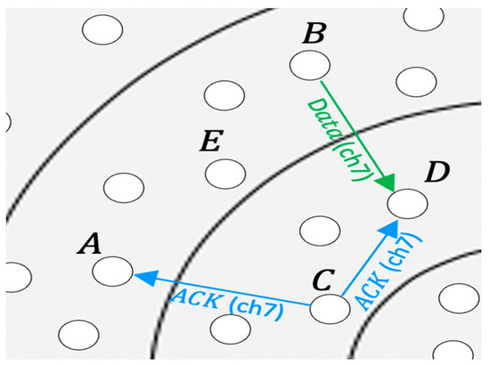 For example, as shown in Figure 9, if node Z wakeup at line 1, and use channel 1,2, and 3 for downstream communications, their upstream forwarder (node F and node G) will have 11 non-used channels (5–15 for node F and 4, 6–15 for node G) available to use with sink. If node F asks for channel and the sink assigns channel 6 to node F, then the sink will have 14 channels left (1–5, 7–15) to assign for nodes waking up in line 1. Then, node G can be assigned one of the 10 non-used channels (4, 7–15), where channel 6 is assigned to node F.