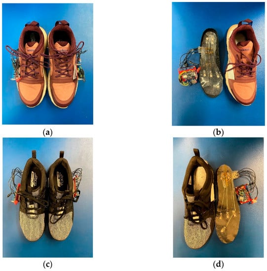 Ankle angle detection system: (a) women’s size 8.5 shoes with an integrated microcontroller and data transmission circuit; (b) insole with FSRs and a detection circuit for the women’s shoe; (c) man’s size 10.5 shoes with an integrated microcontroller and data transmission circuit; (d) insole with FSRs and a detection circuit for the man’s shoe.